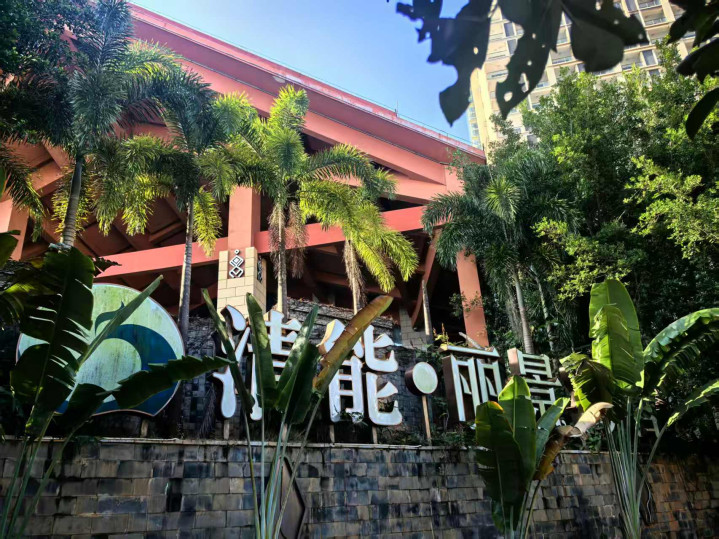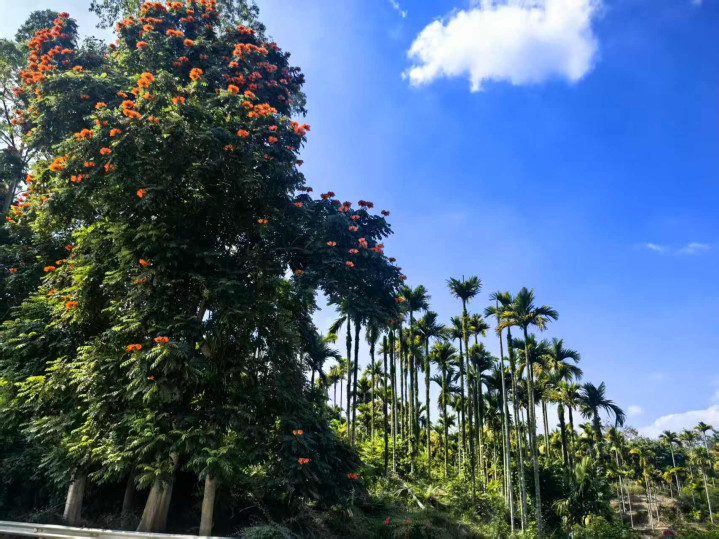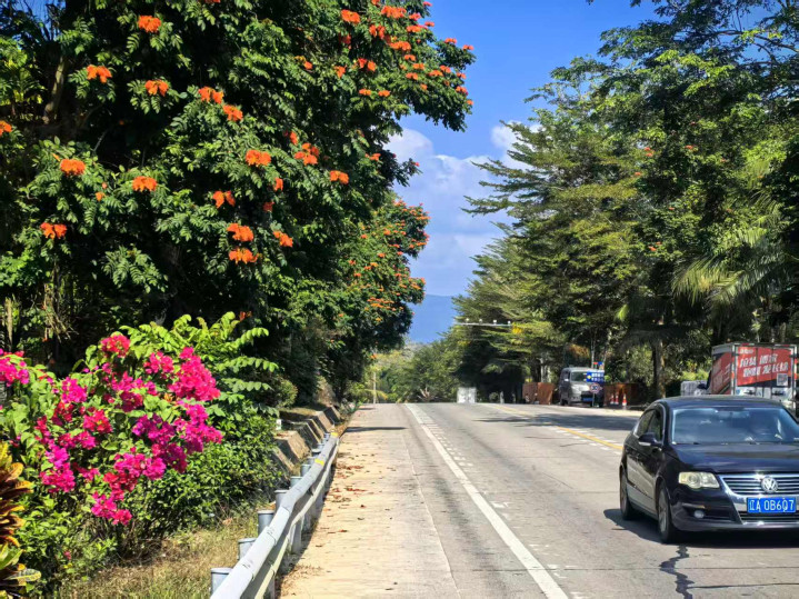 离开五指山市,经保亭到陵水。保亭走了一段国道三六一,蜿蜒而旖旎的风光别有韵致,阳光明媚,椰树棕榈之间山花烂漫。利用汽车充电的时间,还参观了一处“悦溪山庄”。