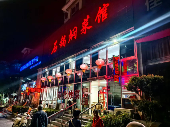 晚间的三月三广场有很多人跳广场舞,有些还着民族服装,一众跳新疆舞的,十有八九是北方来的候鸟人群。音乐彩灯迷离中人们大都悠然自得,跳的和看的都沉浸在轻松愉快的氛围中。广场一家“石锅焖菜馆”门头的东北菜馆印象深刻,量大管饱的做派够豪爽,一份干炸黄鱼,足够大的十五条鱼。一份烧茄子,足有一般店家的三份多。